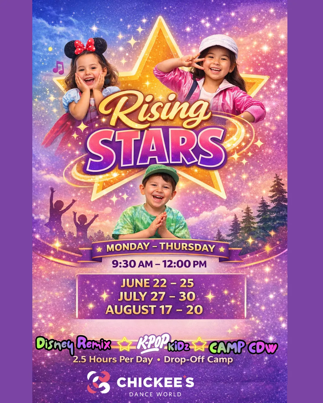 Rising Stars Camps are designed for dancers ages 5–7 who are ready for a fun, structured summer experience that builds confidence and independence. Each themed camp allows dancers to explore movement, musicality, and age-appropriate choreography—no prior dance experience required. Rising Stars is the perfect bridge between preschool dance programs and more advanced summer camps, helping young dancers feel successful, inspired, and excited to grow.
