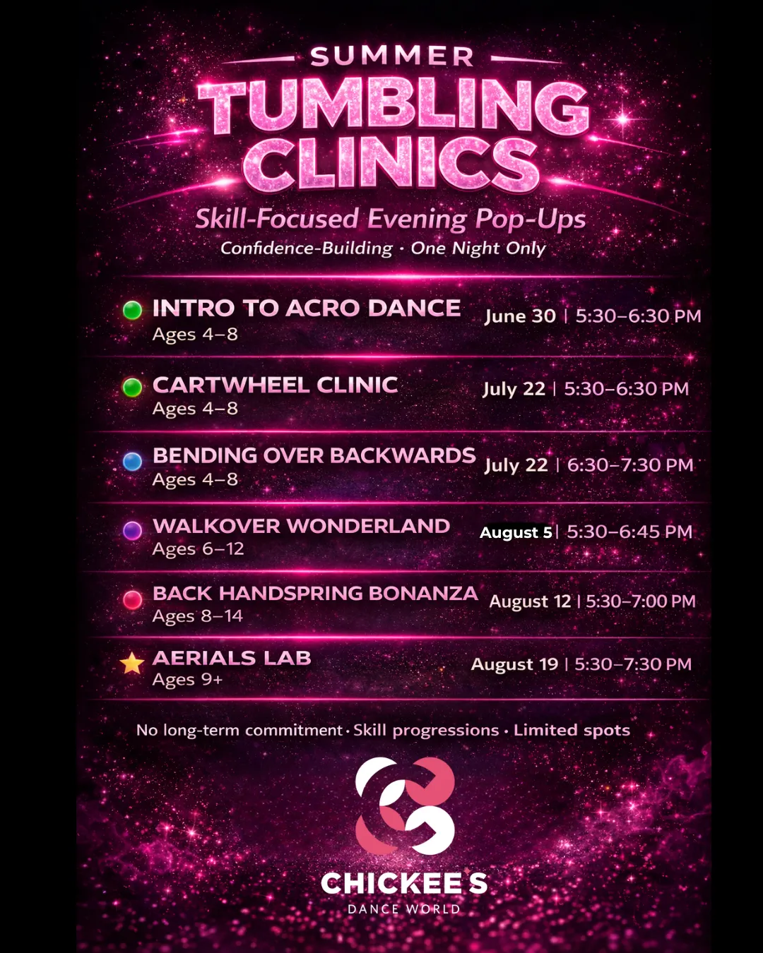 Acro Clinics are low-commitment, skill-specific pop-up classes designed to help dancers build strength, confidence, and technique in a fun, supportive environment—perfect for trying new skills or strengthening foundations.